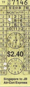 Tiket kami beli di agen bus di terminal seharga 2,4SGD. Saat menjalani proses keimigrasian, bus yang dinaiki ini tidak akan menunggu. Tapi jangan kuatir karena setelah proses imigrasi selesai, kita tetap bisa melanjutkan perjalanan ke Johor Bahru naik bus dari PO yang sama. Saat menunggu bus datang, penumpang sudah dikelompokan sesuai nama busnya. Tinggal cari papan nama bus yang kita naiki sebelumnya. Jadi tiket bus harap disimpan baik-baik, dan ingat warna bus yang kita naiki.