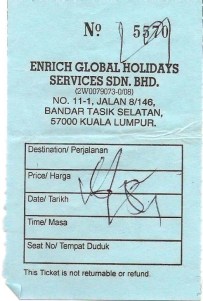 Akhirnya kami terpaksa ke terminal sementara di Bukit Jalil. Sampai disana, kami langsung mencari agen bus Konsortium yang menjadi pilihan sesuai itinerary. Sayangnya, malam itu semua tiket dari PO tersebut sudah sold out. Tak ada satupun kursi tersisa. Karena kami harus berangkat malam itu juga, kami ‘setengah menghamba’ meminta dicarikan dua tiket. Setelah dicari sana sini, akhirnya tiket ke Hatyai kami dapatkan juga. Harganya 48RM. Lega, tapi sekaligus kuatir karena bus yang akan kami naiki bukanlah bus yang kami rencanakan sebelumnya.