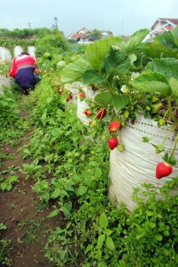 Seakan belum puas beli stroberi dari penjual, operator trip membawa kami ke kebun stroberi. Oooouuw senangnyaaa. Bisa memetik buah langsung dari pohonnya memang sangat menyenangkan. Sayang tidak gratis, karena untuk perkilo stroberi yang dipetik, kami diharuskan membayar Rp 40 ribu. Aaah whatever, petik sana petik sini.