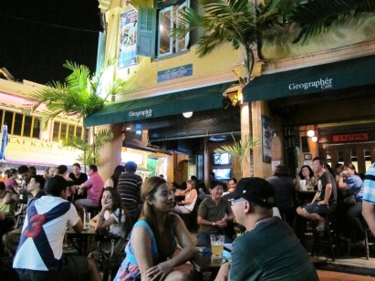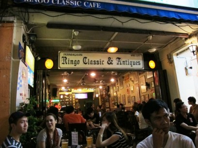 Sambil melepas lelah dan meresapi suasana malam Minggu di jantung destinasi Melaka itu, kami ngobrol santai di Ringo cafe. Sebelum berangkat ke Malaysia saya mendapat masukan dari mbak Arie, travel writer idola saya, cafe mana saja di Jonker Street yang menurutnya asyik. Dan ia menyarankan dua cafe; Ringo serta Geografer. Ringo, menurutnya sedikit lebih memberikan kesan intim ketimbang Geofrafer. Dari segi kocek, Ringo juga sedikit lebih terjangkau. “Juga, kalau mau suasana yang lebih oldies, ke Ringo saja. Ada banyak poster-poster tua dipasang sebagai interior cafe,” ujar Mbak Arie kepada saya. Okelah, padahal di Ringo kami hanya memesan dua botol bir dan segelas orange juice.