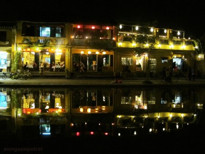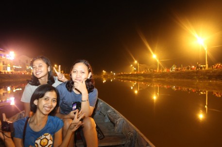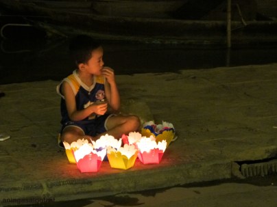 Dari sampan kita bisa memandangi kerlip lentera yang dipasang di tiap bangunan dari kejauhan. Indah! Terus, agar lebih afdal, kita bisa “melarung” lilin yang dibungkus dalam sebuah kertas warna-warni berbentuk bunga lotus seperti yang menjadi ‘kebiasaan’ pelancong maupun penduduk lokal. Harganya tidak mahal, sekitar 5000 VND. Konon jika melakukan hal itu akan mendatangkan kebahagiaan, keberuntungan serta cinta dalam kehidupan kita. Jadi, jangan heran apabila dari jauh kita melihat kerlip cahaya di atas sungai. Cahaya itu datang dari lilin yang masih menyala…