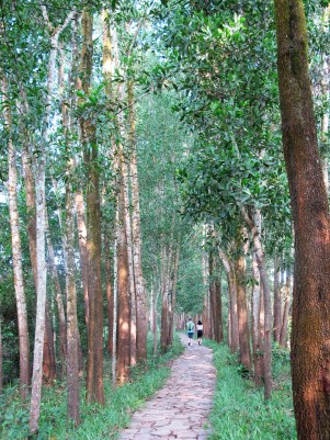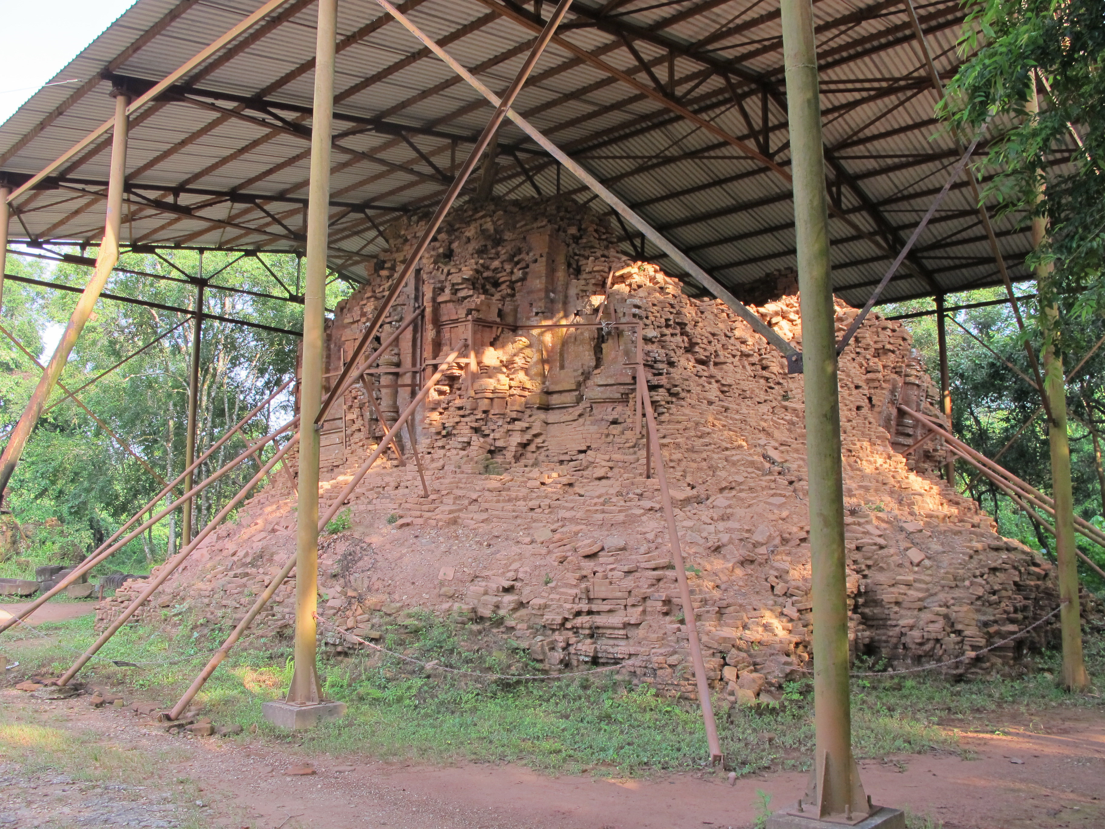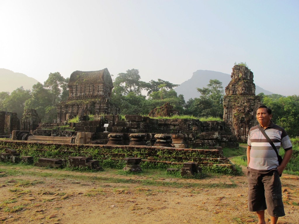 Begitu tiba di sana, matahari sudah sedikit tinggi. Untuk mencapai lokasi utama, kami harus berjalan kaki beberapa ratus meter dari tempat parkir kendaraan. Kawasan My Son dikelilingi hutan dan bukit. Candi My Son yang dipengaruhi agama Hindu merupakan peninggalan Kerajaan Champa, yang berkuasa di Vietnam Tengah pada abad 2-17. Saat Perang Vietnam, sesuai perjanjian yang disepakati bersama, pihak AS dilarang membom kawasan ini. Itulah mengapa tentara Viet Kong kemudian menjadikan kawasan My Son sebagai salah satu markas mereka.