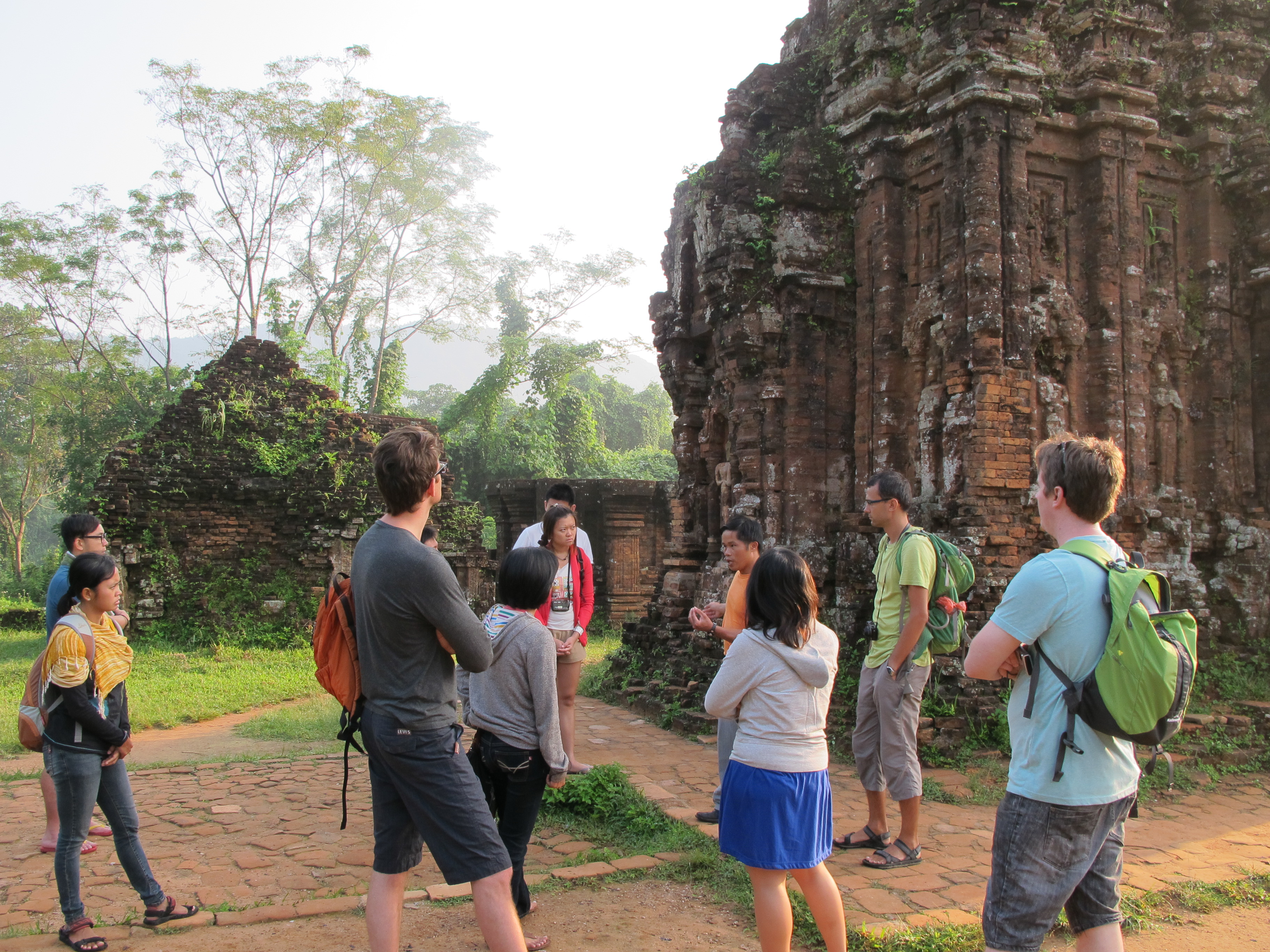 Kebetulan, hostel di mana kami menginap menyediakan paket ‘My Son sunrise tour’. Harganya juga terjangkau. Saya lupa pastinya, mungkin sekitar 6-7USD/pax. Dengan membayar sejumlah itu kami mendapatkan tur berdurasi sekitar lima jam termasuk waktu tempuh serta makan pagi. Ada beberapa opsi lain untuk sunrise tour ini, yakni, seusai mengunjungi My Son, pelancong bisa kembali ke Hoi An, tapi menggunakan perahu alias menyusuri sungai. Di brosur tertera pelancong juga akan diajak berhenti mendatangi sebuah kampung nelayan. Namun, kami memutuskan tidak mengambil tur tersebut karena waktu kami tak banyak.