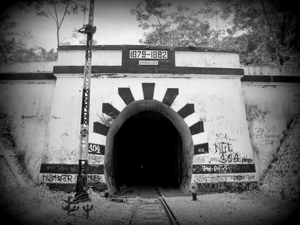 So, setelah menempuh perjalanan sekitar 3,5 jam kami sampai di tujuan pertama, yakni Stasiun Lampegan. Stasiun peninggalan kolonial Belanda ini mulai dibuka pada 1882 dan sekarang sudah tidak aktif lagi. Dari hasil-hasil brosing sebelum ke Cianjur, saya memperoleh info mengenai adanya legenda di stasiun ini. Yah, namanya bangunan tua pasti ada saja kisah menarik yang menyertai. Di sini rombongan banyak yang memutuskan berjalan untuk mencapai ujung sisi lain terowongan rel.