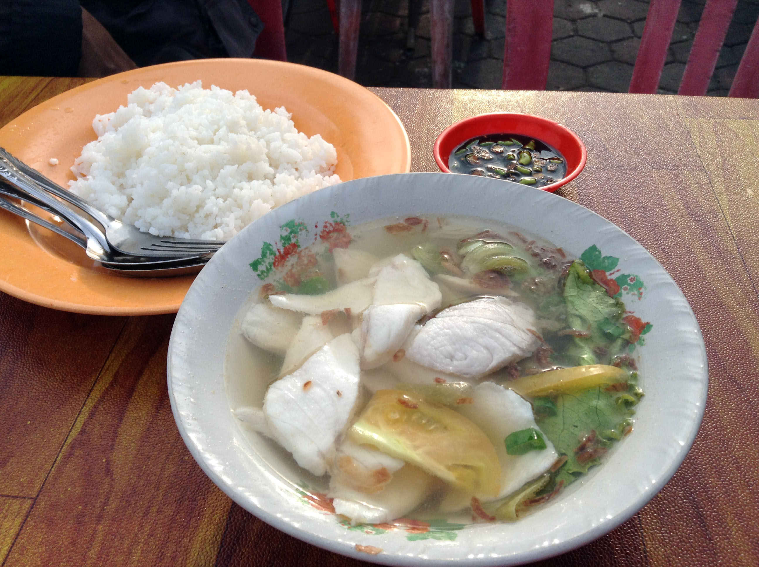 Saya sempat waswas bila sup ikan-nya amis. Maklum, saya pernah menyantap sup ikan yang nggak banget menurut saya. Ternyata, sesuai yang digembor-gemborkan, sup ikan Tanjung Pinang memang hao shi (lezat)! Kala disantap tanpa nasi, kuah sup terasa segar, dan bebas amis. Potongan ikannya juga lembut. Tinggal tambahkan sambal, mantap deh dinikmati selagi kuah masih panas.