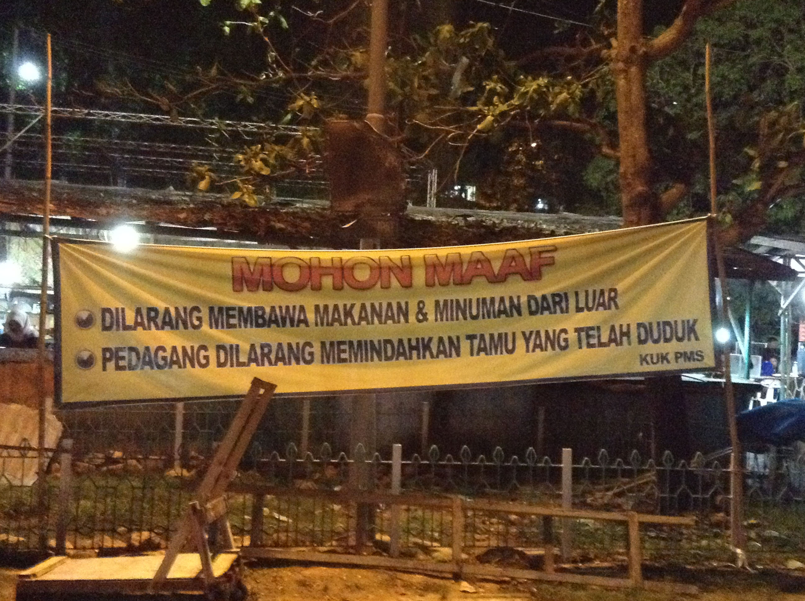 Dengan sedikit tercengang karena diusir, kami memilih menuruti permintaan tak menyenangkan mbak itu. Kami duduk beberapa meja jauhnya. Tak lama kemudian, saya baru paham dengan spanduk besar yang terpampang di sejumlah titik, yang saya lihat sejak tiba di lokasi itu. “Mohon untuk tidak memindahkan tamu yang sudah duduk.” Begitu tulisan di spanduk. Ooh, jadi pengusiran tamu seperti yang saya alami sudah kerap terjadi sehingga pihak berkaitan sampai merasa perlu menindaklanjuti hal itu.