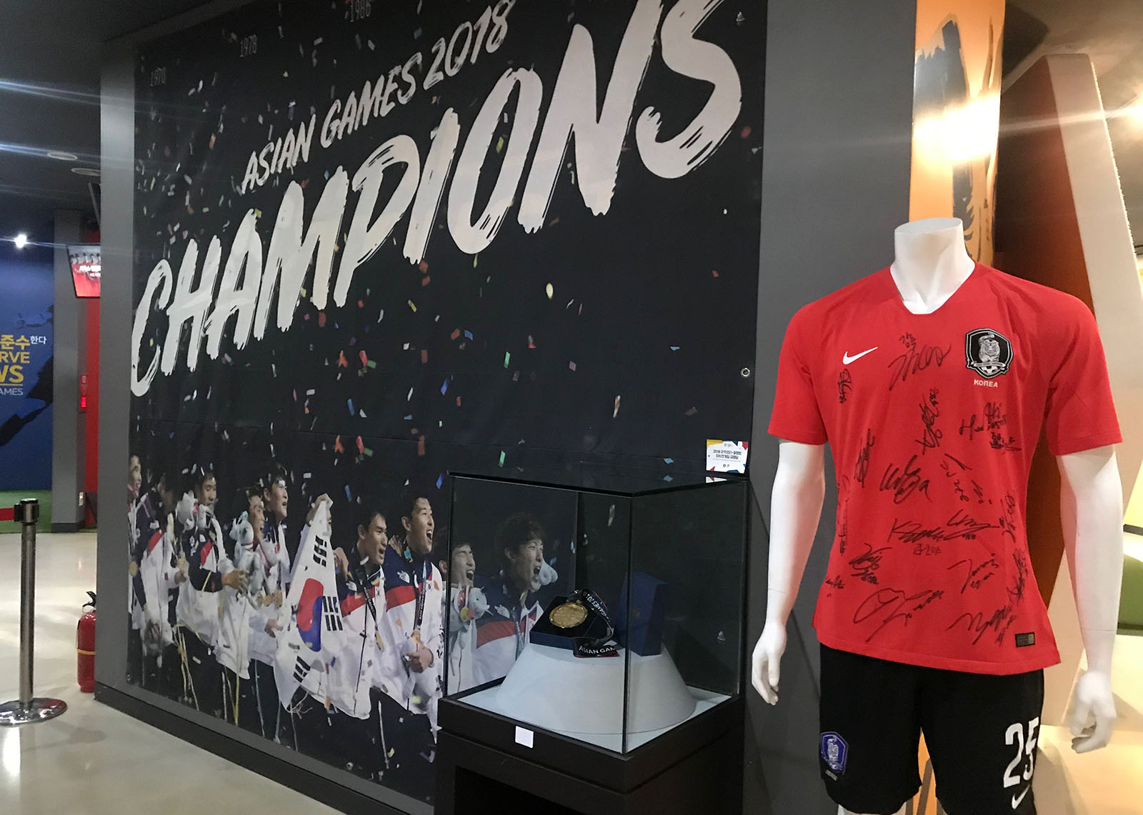 Kita juga bisa “berjumpa” dengan pemain-pemain Timnas Korsel di Piala Dunia 2002 semisal Park Ji-sung dan Lee Young-pyo, Oh ya, medali emas yang meraka raih di cabor sepak bola putra Asian Games 2018 juga sudah dipamerkan di sini…
